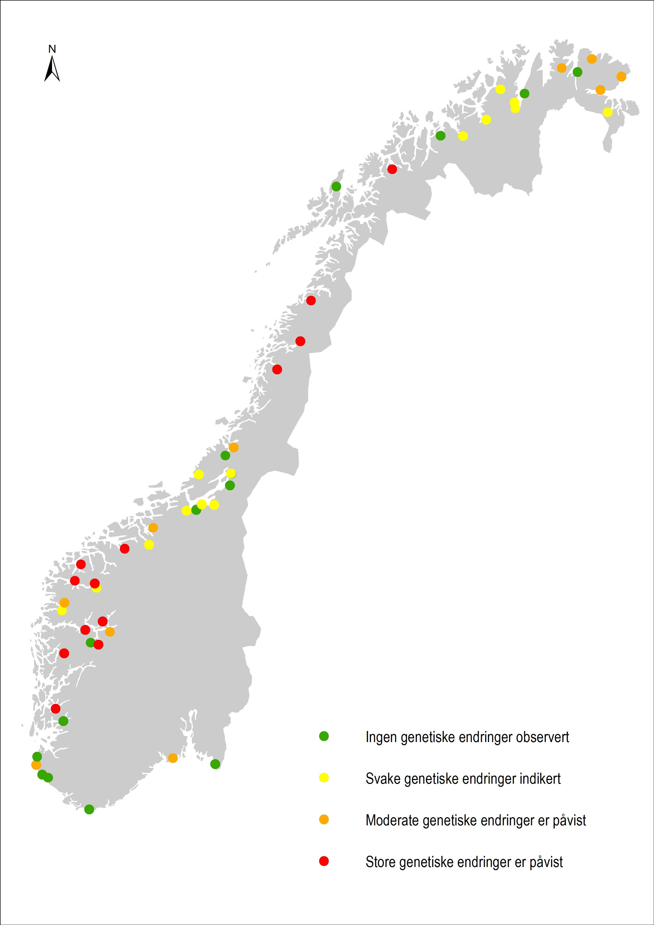 Store genetiske endringer som følge av innblanding med rømt oppdrettslaks er påvist i en fjerdedel av de nasjonale laksevassdragene, og moderate genetiske endringer er påvist i ytterligere en femtedel – blant disse er ett av våre største laksevassdrag, Namsen.