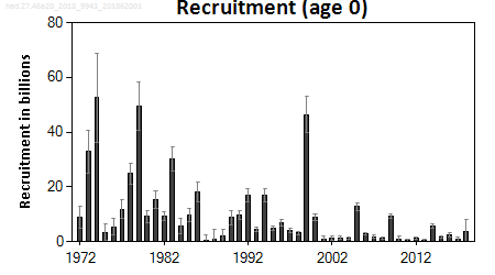 Det ble produsert flere tallrike årsklasser før 2000, men rekruttering har hatt en tendens til å være konsekvent lavere siden da. På grunn av den større 2014-klassen er SSB over MSY Btrigger. Bestandsutviklingen styres i stor grad av sporadisk større årsklasser, noe som resulterer i svært varierende råd. Størrelsen på disse sterke årsklassene er avtagende.