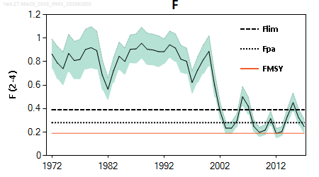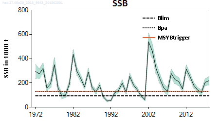 Fiskedødelighet (F) har fluktuert over FMSY i mesteparten av tidsseriene og er over FMSY i 2017. Gytebiomassen (SSB) har stort sett vært over MSY Btrigger siden 2002. Rekruttering har siden 2000 vært lav med sporadiske større årsklasser, men størrelsen er avtagende.