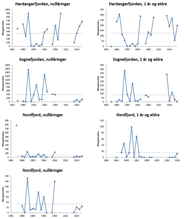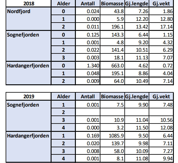 Toktindeksene er vist per fjord i Figur 2. For 2018- og 2019-indeksene, vises aldersfordelingen i Tabell 2. Når 2018-2019 indeksene sammenlignes med resten av tidsserien, ser vi at det er svært lite å se i Sognefjorden. I Nordfjord er det litt under middels forekomster av både 0 år og ett år og eldre brisling (2018-indeksene). Dette er første år på lenge at det er både rekrutter og eldre fisk i Nordfjord, så her vil det være viktig å ikke ta ut for mye i 2019-fisket. I Hardangerfjorden er 2018-indeksen over gjennomsnittet for nullåringer, noe som gjenspeiles i en 2019-indeks over gjennomsnittet for eldre brisling (men husk at denne indeksen er fra før og ikke etter fisket, som resten av tidsserien) der 1 år gammel brisling utgjør 86%. Nesten 40% av 1-åringene var minst 10 cm allerede i juni-juli. 1-åringene var minst i de indre delene av Hardangerfjorden, spesielt innenfor Kvanndal-Utne.Toktindeksene tyder på at det er grunnlag for å åpne for et fiskeri i både Hardangerfjorden og Nordfjord, men