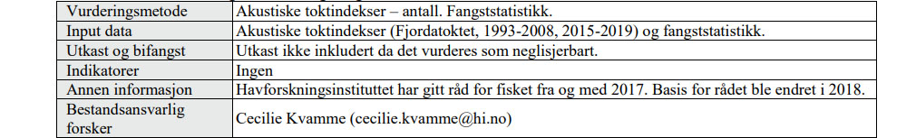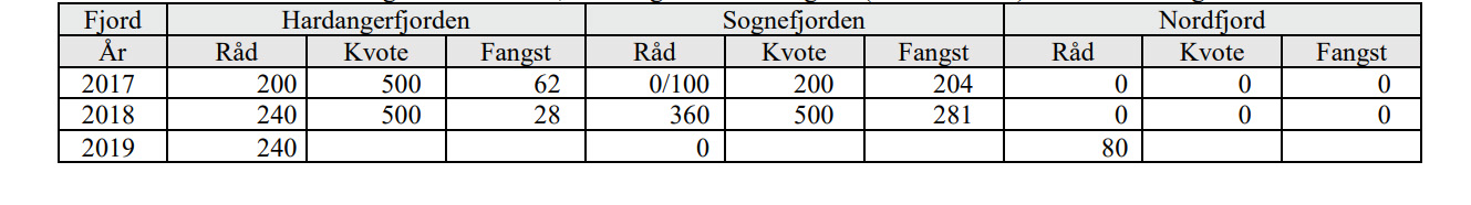 I rådet for 2017 og 2018 ble toktindeksene fra 2016 og 2017 brukt til å vurdere om det burde åpnes for et fiske, og for Hardangerfjorden ble indeksene vurdert til å være høye nok til et fiskeri begge år, og for 2018 også Sognefjorden. Gjennomsnittlig fangstmengde for 2002-2016, når de tre årene med størst fangster ble tatt ut, etter at en hadde redusert dette gjennomsnittet (250 tonn) med 20% i tråd med ICES sin praksis for såkalte databegrensede bestander (data-limited stocks) (200 tonn) ble så brukt som et passelig nivå for kvote ved åpning. I samarbeidsmøtet som ble avholdt i 2018 ble denne fremgangsmåten kritisert av næringen, fordi årene med de største fangstene ble tatt ut. Havforskningsinstituttet forstod at dette oppleves som strengt, og brukte derfor median-fangsten av alle årene i rådet for 2018-fisket. Medianen ble brukt i stedet for et gjennomsnitt, fordi den ifølge Store norske leksikon (https://snl.no/median) «foretrekkes fremfor det aritmetiske gjennomsnitt når man 6 ønsker å beskrive den sentrale tendensen i materialet og ikke vil gi ekstreme verdier stor vekt». Tabell 1 viser fangstene i de tre fjordene i perioden 2002-2016, samt medianen per fjord for denne perioden. Medianen for Hardangerfjorden, Sognefjorden og Nordfjord ligger på henholdsvis omtrent 240, 360 og 80 tonn.