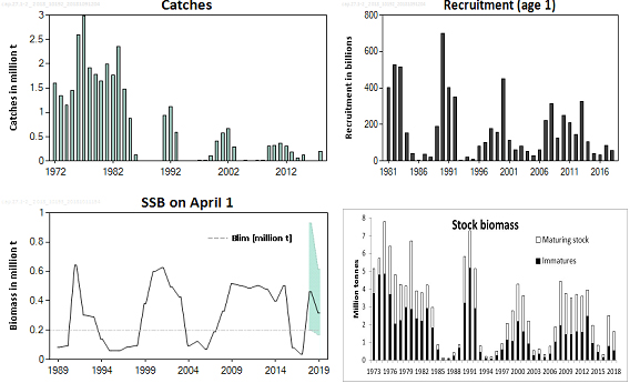ICES reknar at gytebestanden 1. april 2019 mest sannsynleg vil vera på 317 000 tonn, men at det er 11% sannsyn for at gytebestanden kjem under 200 000 tonn.