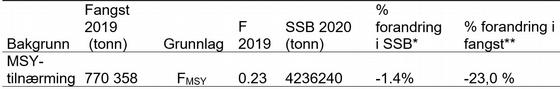 | Bakgrunn | Fangst 2019 (tonn) | Grunnlag | F i 2019 | SSB i 2020 (tonn) | % forandring i SSB* | % forandring i TAC** |