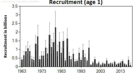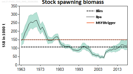 Det siste bestandsestimatet resulterte i en nedskalering av SSB de siste år. Dette skyldes delvis en under forventet fangstrate på toktene av 2013 og 2016 årsklassene i IBTS Q1 og, i mindre grad, IBTS Q3 toktet i 2017.