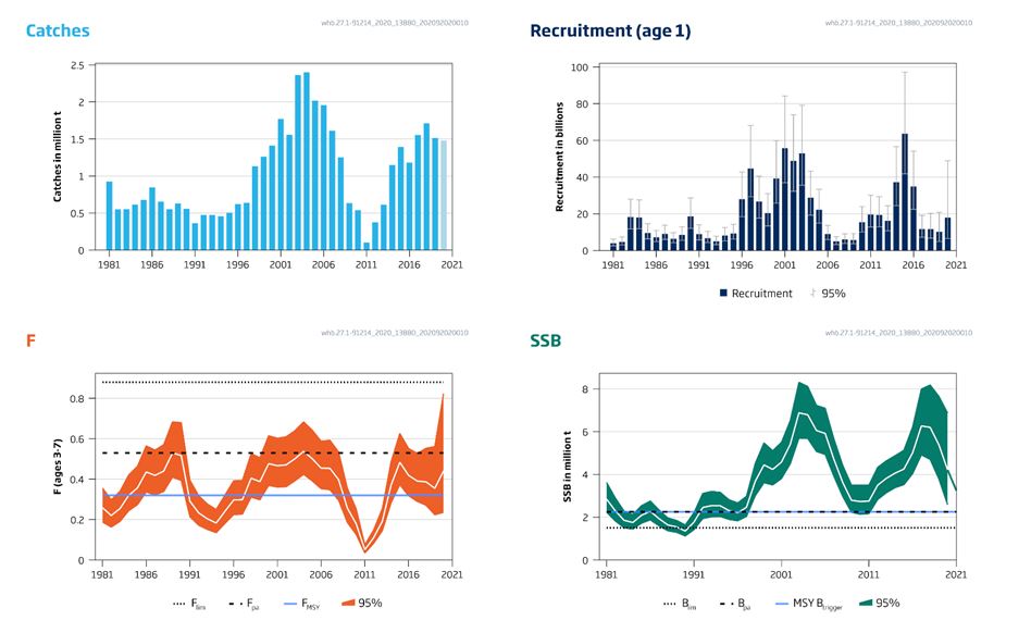 Fiskedødeligheten er estimert til å være over FMSY siden 2014. Gytebestanden har minket siden 2018, men er estimert til å være over MSY Btrigger. Rekrutteringen i årene 2017 til 2020 er beregnet til å være svak, etter en tre-årig periode med sterk rekruttering.