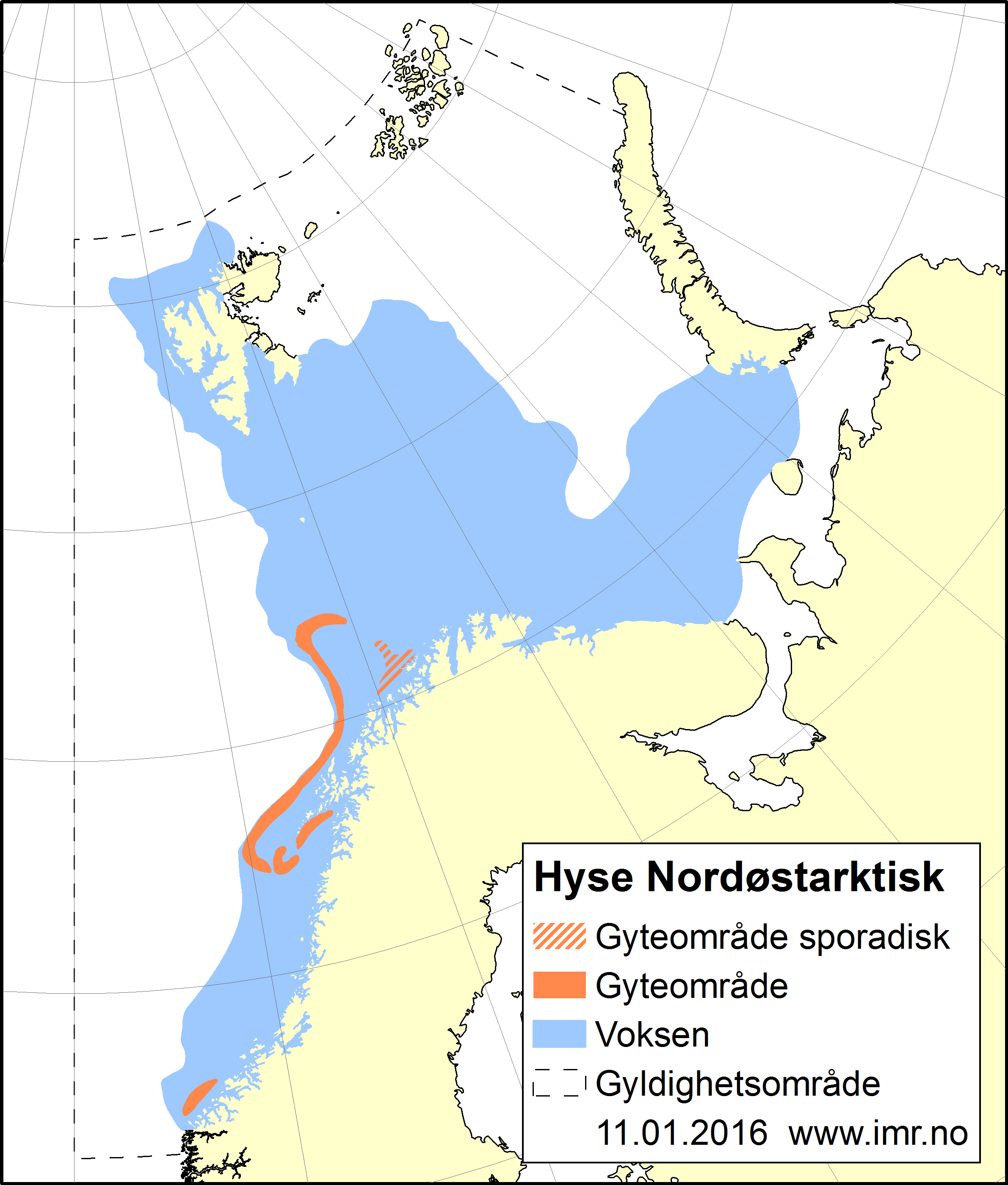 Fotograf: Erling Svensen / HavforskningsinstituttetAll hyse langs norskekysten nord for Stad, i Barentshavet og på vestsiden av Svalbard regnes til denne bestanden, selv om nye genetiske analyser antyder at hysa sør for Lofoton er forskjellig fra hysa lenger nord.