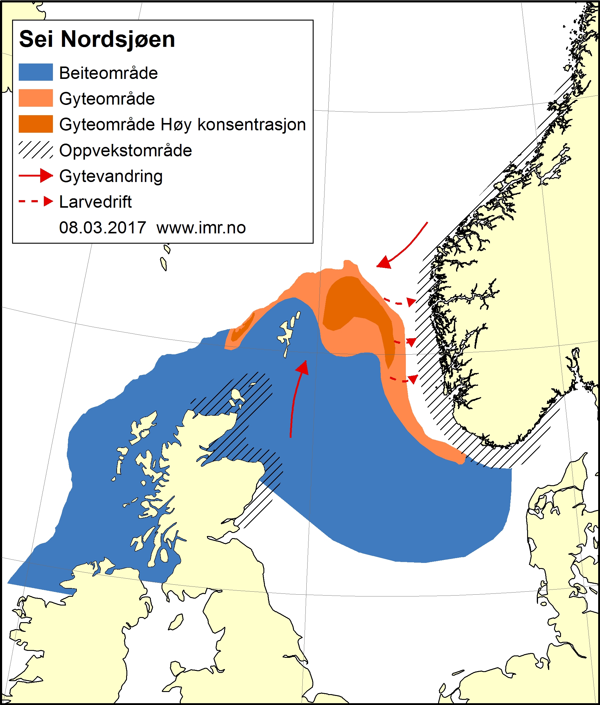 Om sommaren finn vi sei over heile Nordsjøplatået frå ca. 57˚N til 62˚N, men om vinteren brukar seien å samle seg kring gytefelta vest for Shetland og mellom Shetland, Tampen og Vikingbanken. Umoden sei står ofte langs vestkanten av norskerenna, særleg kring Statfjordfeltet og Egersundbanken og søraustover. Dei største konsentrasjonane finn ein langs kanten av Nordsjøplatået, også om sommaren.