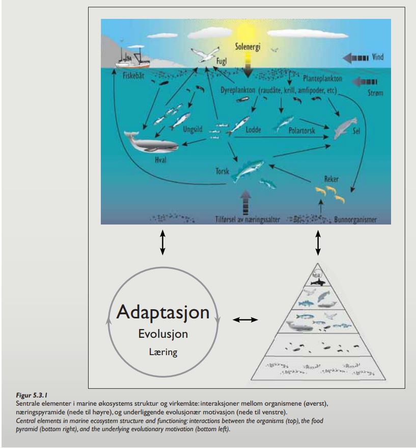 Samspillet mellom organismene i et økosystem – spis og bli spist – danner grunnlag for energistrømmen i næringskjeden. I havet resulterer dette samspillet i en pyramide med store mengder (biomasse) plankton i bunnen og avtagende biomasse oppover i næringskjeden. Mellom hvert nivå skjer det et tap av energi, fordi ikke all energi som inntas blir tatt opp av organismen, og fordi organismen forbruker energi til respirasjon, forflytning og reproduksjon. Overføringseffektiviteten for hvert ledd i økosystemet er på ca. 10 %. Marine økosystemer har derfor ofte ti ganger større biomasse av dyreplankton enn av planktonspisende fisk. Men det er ikke alltid slik, planteplankton kan for eksempel forsyne en større biomasse på neste nivå i næringskjeden fordi de formerer seg like raskt som de blir spist. For å forstå hvordan økosystem fungerer, er det vesentlig både å fange opp interaksjonene mellom organismene og den resulterende næringspyramiden, samtidig som det er viktig å ha i bakhodet at organismene lever livet utifra hva som lønner seg i et evolusjonært perspektiv. Figur 5.3.1 illustrerer nettopp disse forskjellige dimensjonene i økosystemet med interaksjoner, biomasse og den underliggende biologiske drivkraften. Samtidig indikerer pilene i figuren at disse faktorene påvirker hverandre og at økosystemet ikke er et statisk system.