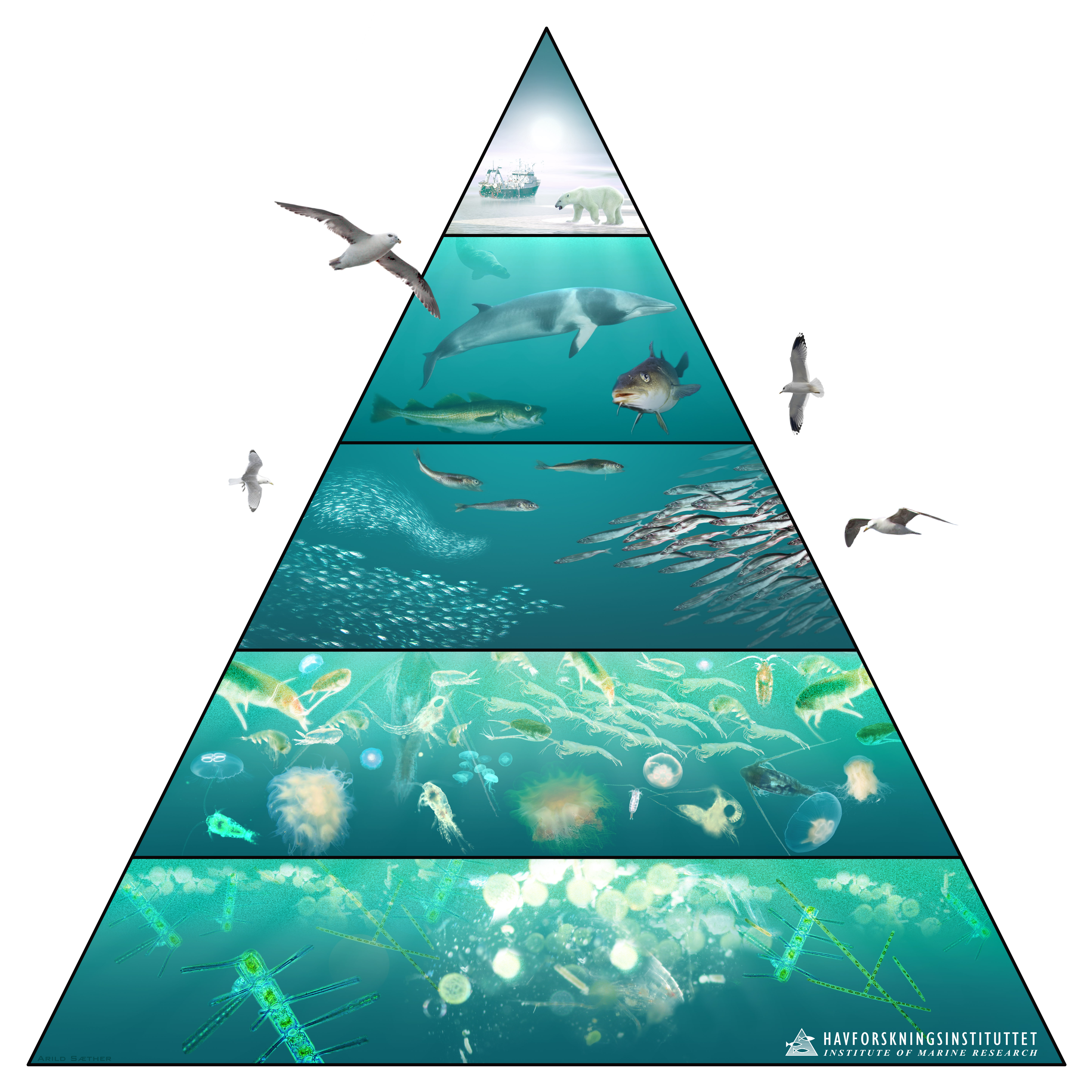 På samme måte som på land, er produksjonen i havet basert på fotosyntese i planter. De bruker energien i lys til å omdanne vann, karbondioksid og næringssalter til energirike organiske stoffer og oksygen. I havet blir fotosyntesen i hovedsak utført av planteplankton, ettersom tang og tare har lav produksjon sammenlignet med planteplanktonet. Alle andre organismer er avhengige av plantene for å overleve, vokse og formere seg. Strukturen i økosystemet i Barentshavet er indikert i figur 5.3.1 (øverst). Der ser vi at planteplanktonet beites på av dyreplankton som kopepoder (hoppekreps) og krill, som igjen spises av en rekke fisk og bardehval. Lenger oppe i næringskjeden finner vi de fiskespisende predatorene som torsk, sel og hval, og helt på toppen er der isbjørn og spekkhogger.