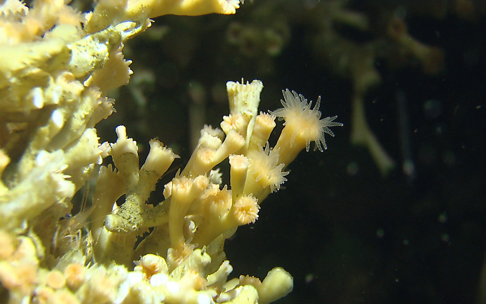 Nærbilde av korall-polypper. Korallen bruker de små "armene" når de fanger mat som driver forbi. Foto: Havforskningsinstituttet.